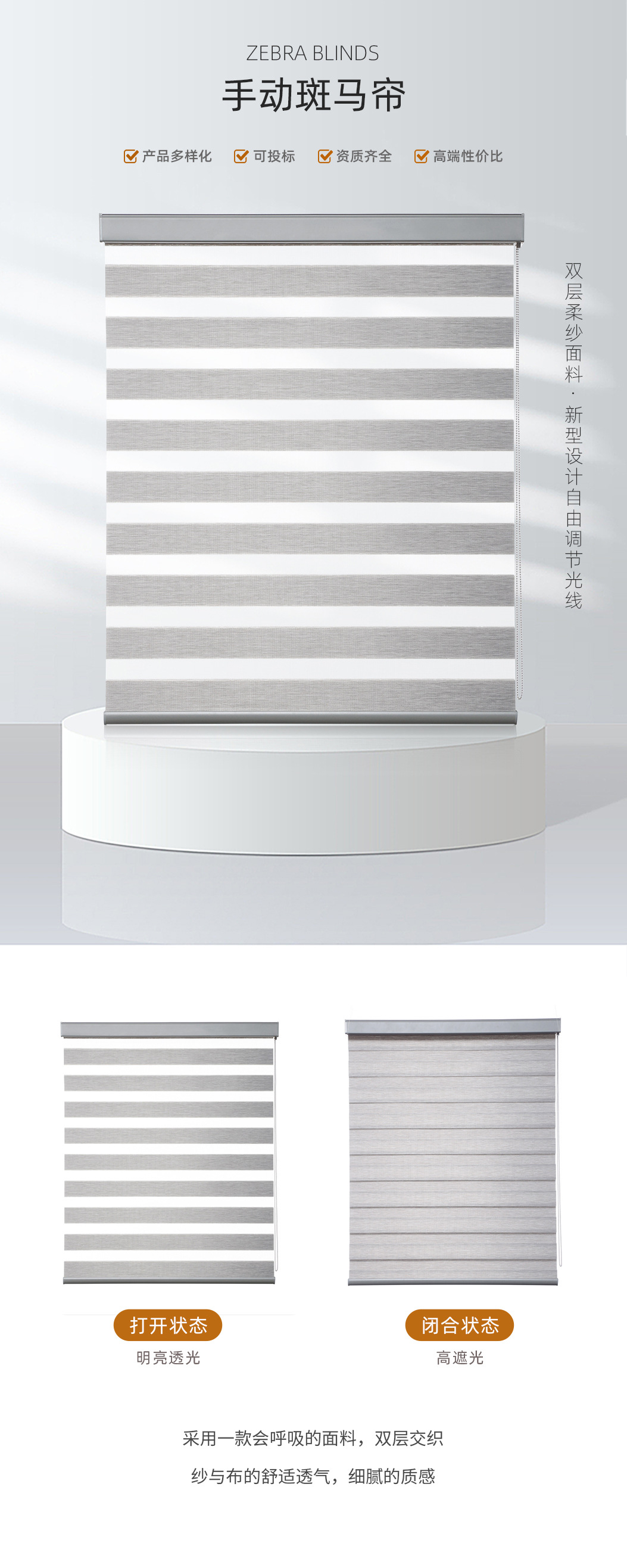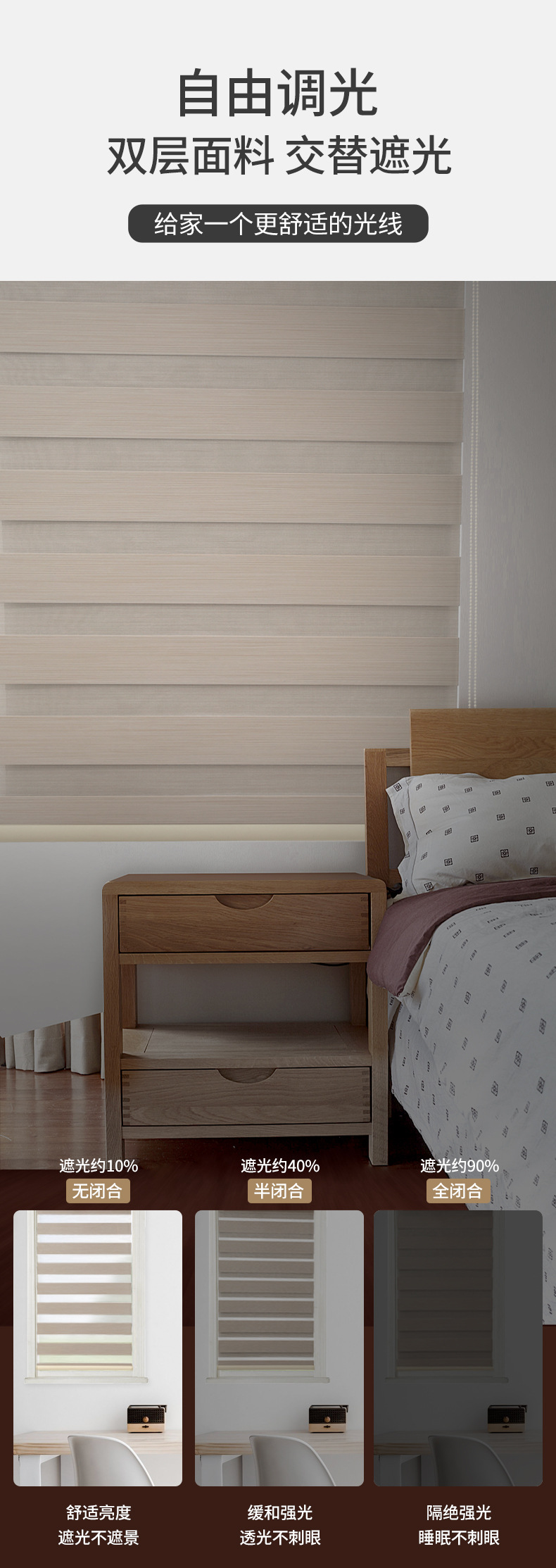 The unique double - layer structure of soft shades, with adjustable fine blades in the middle, enables precise control of light. You can easily adjust the blade angle according to different times of the day, weather conditions, and personal preferences, achieving various effects such as full light transmission, semi - light transmission, and light blocking. In the morning, set it to full light transmission to let the sunlight fill the room. When the sun is intense in the afternoon, adjust it to semi - light transmission to soften the light and create a warm atmosphere. At night, it can be fully blocked to ensure privacy and tranquility. This exquisite light adjustment creates a proper atmosphere for various spaces.