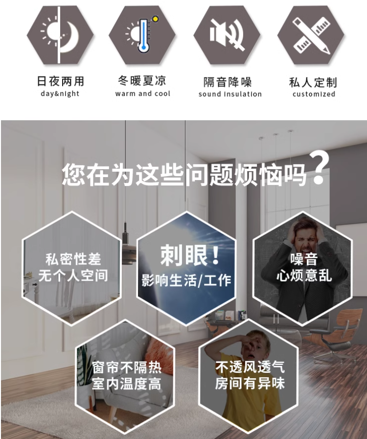 简单说:日夜帘 = 调光帘 + 遮光帘 + 隔热帘 + 隔音帘 + 隐私帘,一帘顶五帘,是现代家居高性价比之选。