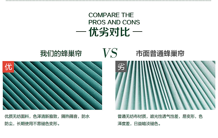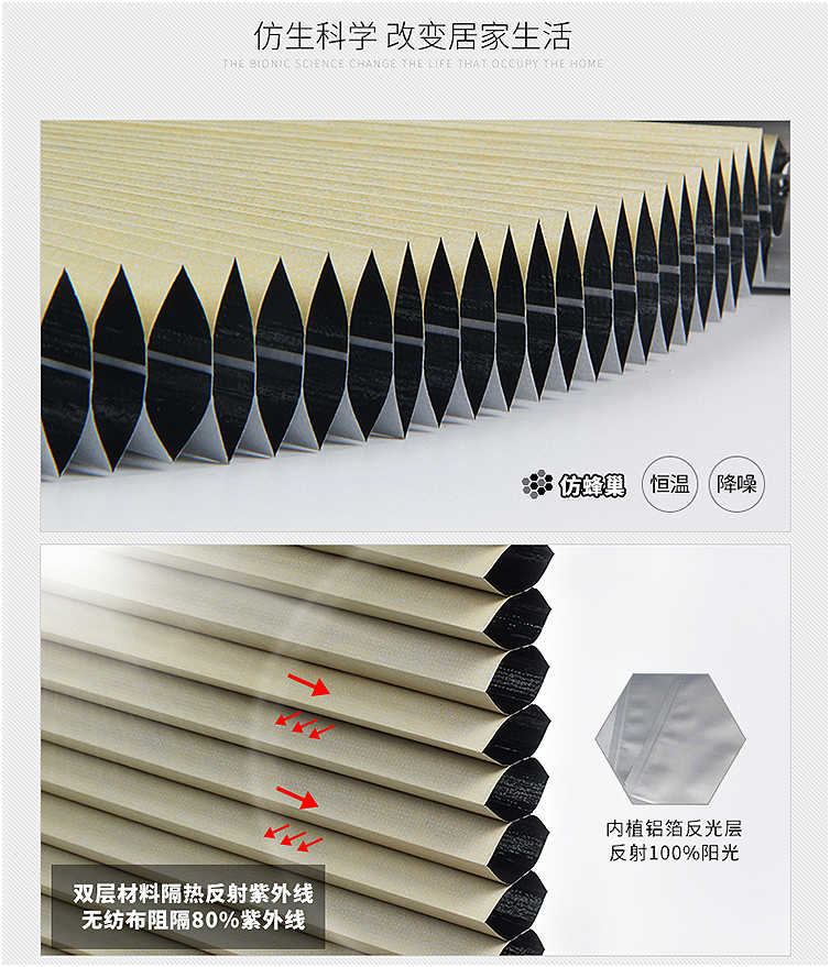- 隔音降噪,营造安静环境蜂窝结构自带吸音效果,能有效减弱窗外噪音,提升居住静谧感。