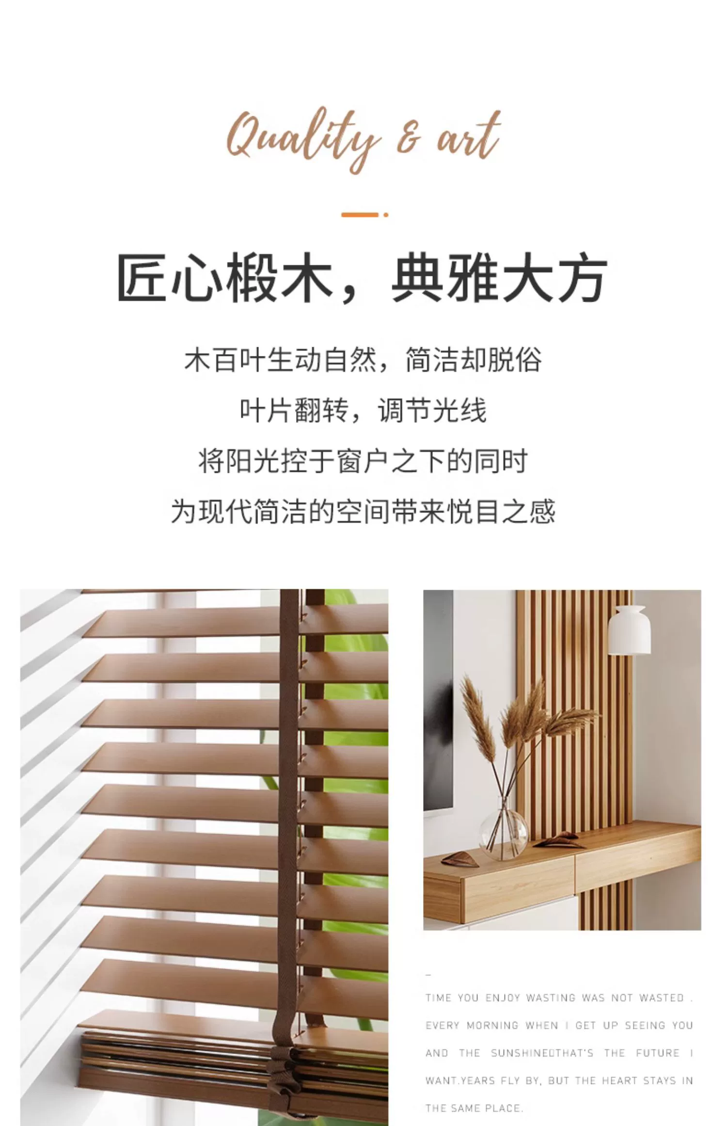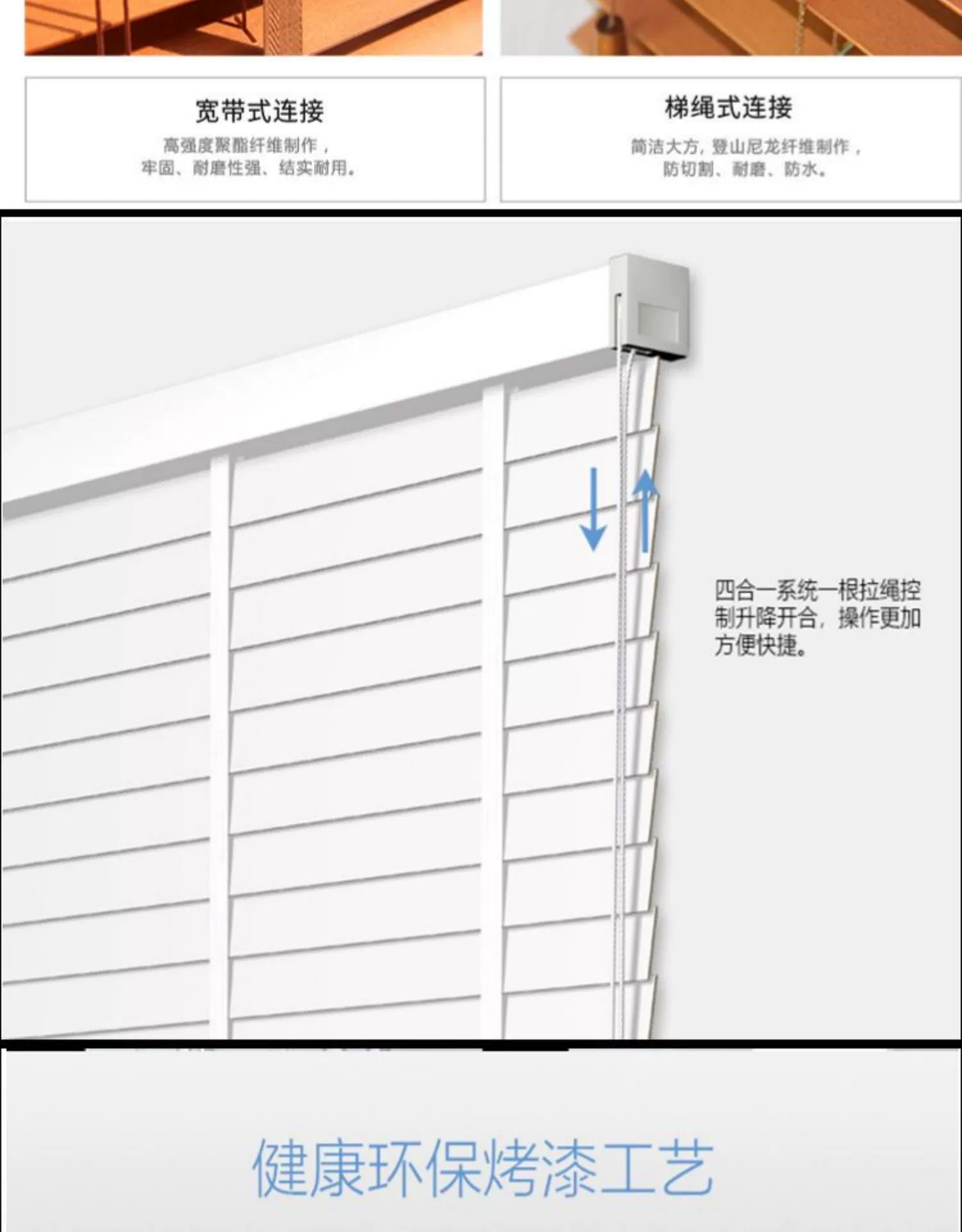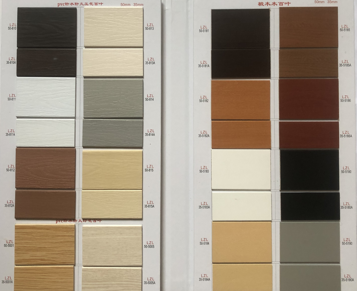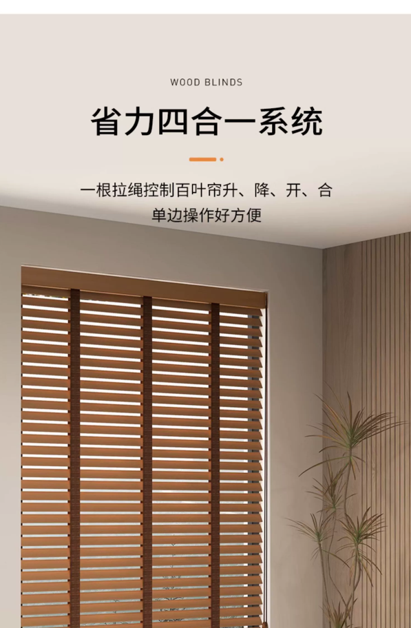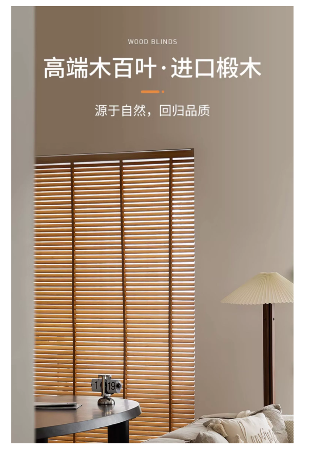 一. 木百叶的6大优势和特点1.天然原木质感,高级百搭甄选实木材质,纹理自然温润,适配新中式、北欧、轻奢、美式等多 种装修风格,提升空间档次与氛围感。2. 自由调光,透光不透人叶片 0-180° 灵活调节,既能引入柔和自然光,又能保护隐私,客厅、 书房、卧室都适用。3. 隔热防晒,节能降噪木材天然隔热属性,有效阻隔强光与热量,降低空调能耗;同时减弱噪 音,守护安静居家环境。4. 环保健康,安全耐用环保漆面工艺,无异味更安心;圆弧叶片不伤手,防蛀防霉处理,使用寿命长,性价比 高。5. 不易积灰,清洁超省心表面光滑不易沾灰,日常用抹布 / 掸子轻擦即可,无需拆洗,告别布艺窗帘难打理烦 恼。6. 通风透气,不闷不潮调光同时保持空气流通,减少室内闷湿,适合南方潮湿地区及各类家 居、办公空间使用。 二. 产品详情 三. 色卡和实例图