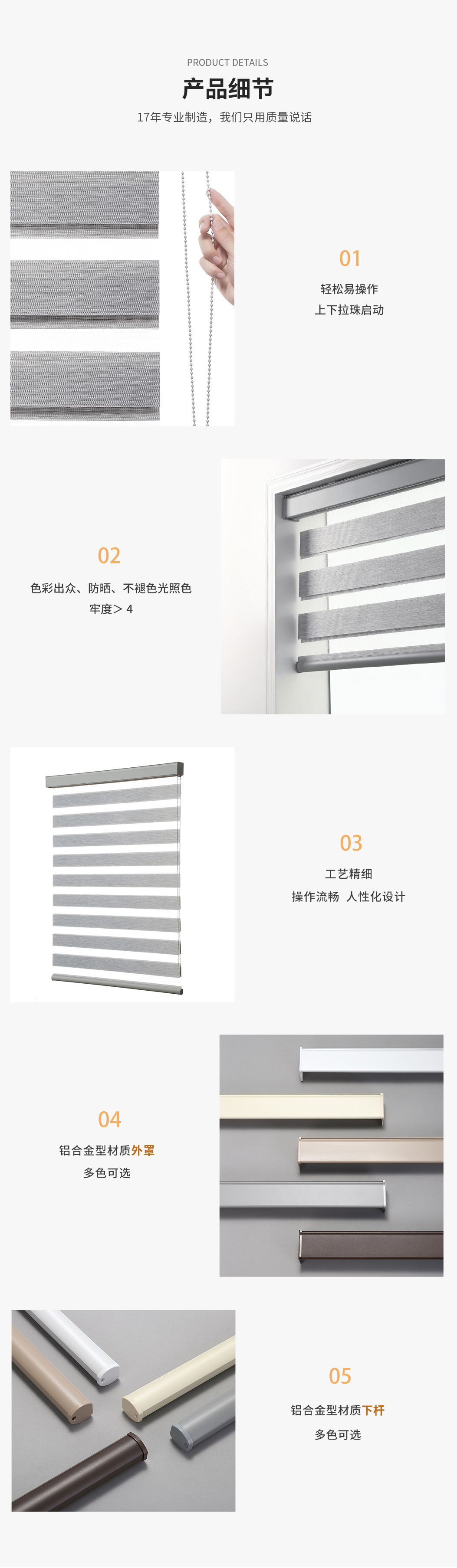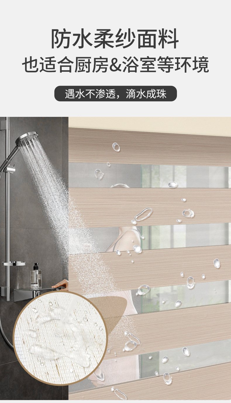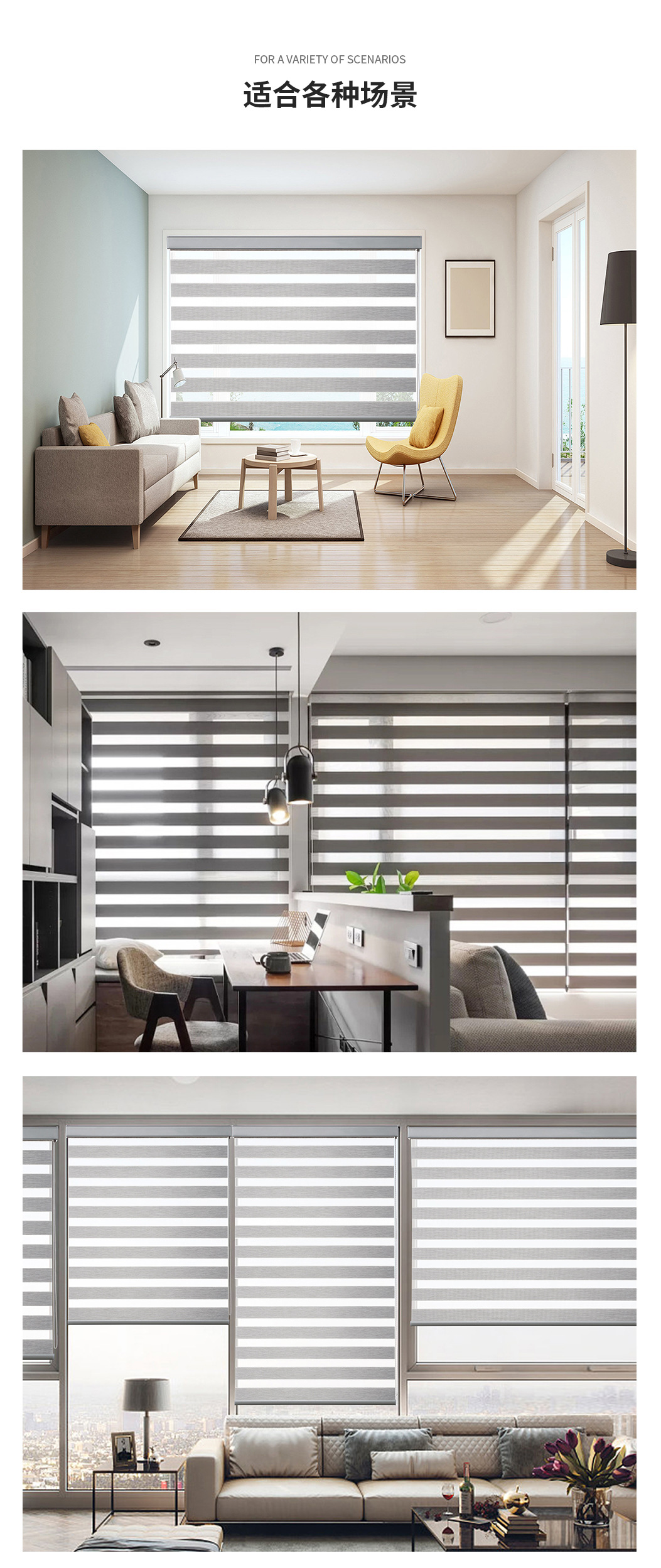 柔纱帘独特的双层结构,中间夹着可调节的细密叶片,能够精准控制光线。你可以根据一天中不同时间、天气状况及个人偏好,轻松调整叶片角度,实现全透光、半透光和遮光等多种效果。早晨,调至全透光,让阳光尽情洒满房间;午后阳光强烈时,调为半透光,柔和光线并营造温馨氛围;夜晚则可完全遮光,确保私密与宁静。这种对光线的精妙调节,为各种空间营造出恰到好处的氛围。